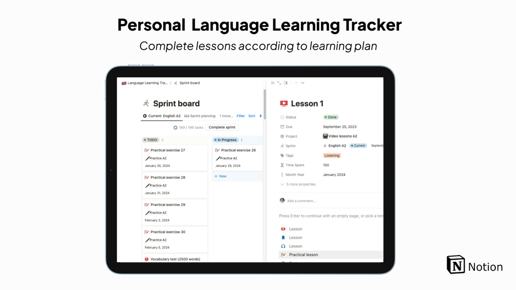 Unlike many templates, this Template is based on learning One Language and uses the Agile system. Each language level is a separate sprint. Close the sprint as soon as you master the language level.