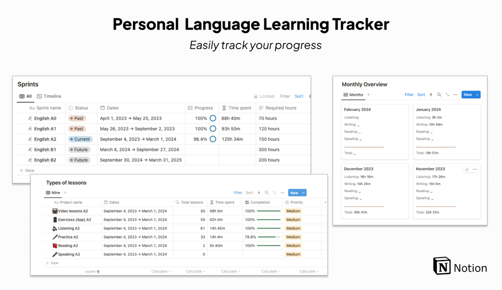 Are you trying to learn a language individually or with a tutor, but don't know how to track your progress? Do you know how much time you have already spent learning a language? This language learning tracker will help you take control of your learning. Create your learning plan and easily track your progress!
