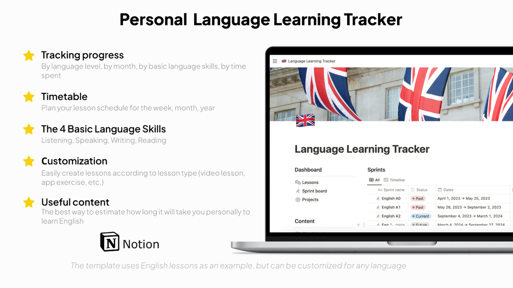 The template is suitable for those who are going to learn the language on their own, as well as for tutors who want to create a language learning plan. I developed this template for personal purposes because I did not find the right template that helped me track my progress.